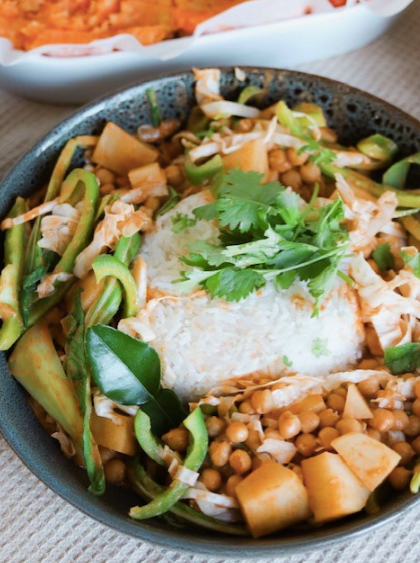 Massaman curry: chickpeas, seasonal green vegetables, basmati rice, turmeric, cumin, lemongrass, kaffir lime, ginger, coriander, bay leaves, vegan stock powder, sunflower oil, coconut cream, onion, garlic